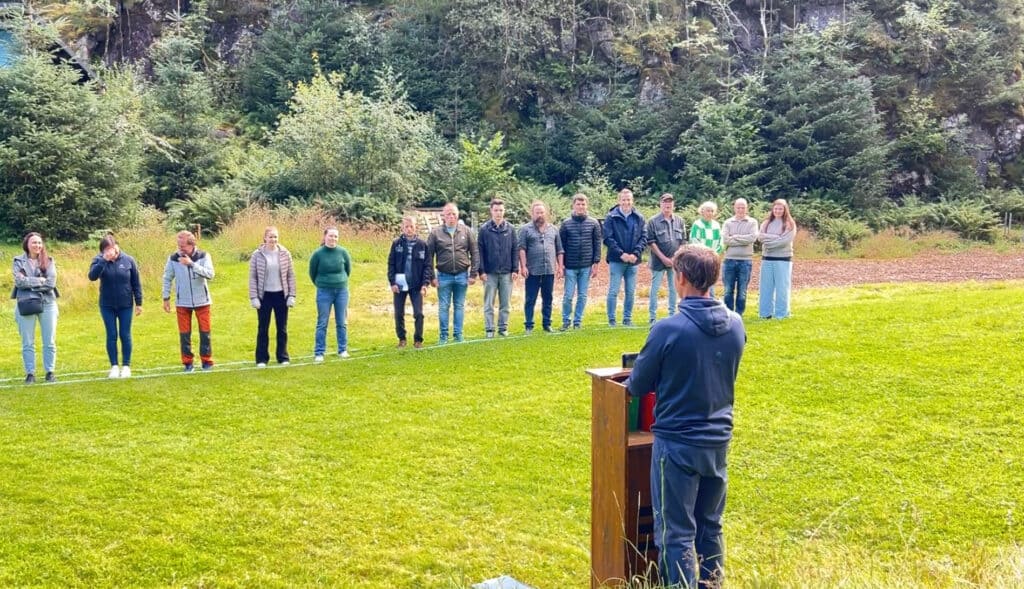 Denne uka fikk bedrifter på Sotra Villmarkssenter prøve seg på en av våre mest populære teambuilding-aktiviteter: «Mesterløypen». Her ser dere bilde av øvelsen “Frem, stille, bak – reaksjonstest”! Her testes både reflekser, samarbeid og evnen til å reagere under press – og med et lite, fargerikt tvist.